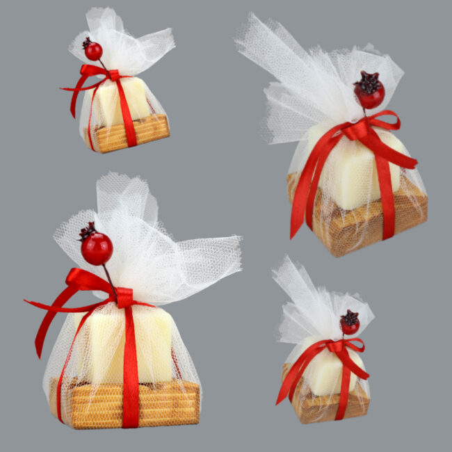 Σετ χριστουγεννιάτικο, ένα σαπούνι περιορισμένης κυκλοφορίας με άρωμα βανίλια σε τούλινο περιτύλιγμα και πάνω σε μικρή τετράγωνη ξύλινη βάση. Ιδανικό για στολισμό του γιορτινού τραπεζιού, θα δώσει μία ξεχωριστή νότα και ένα μεθυστικό άρωμα στο χώρο.