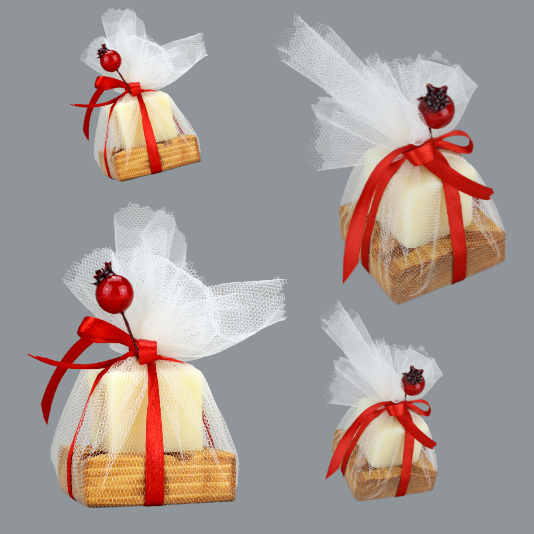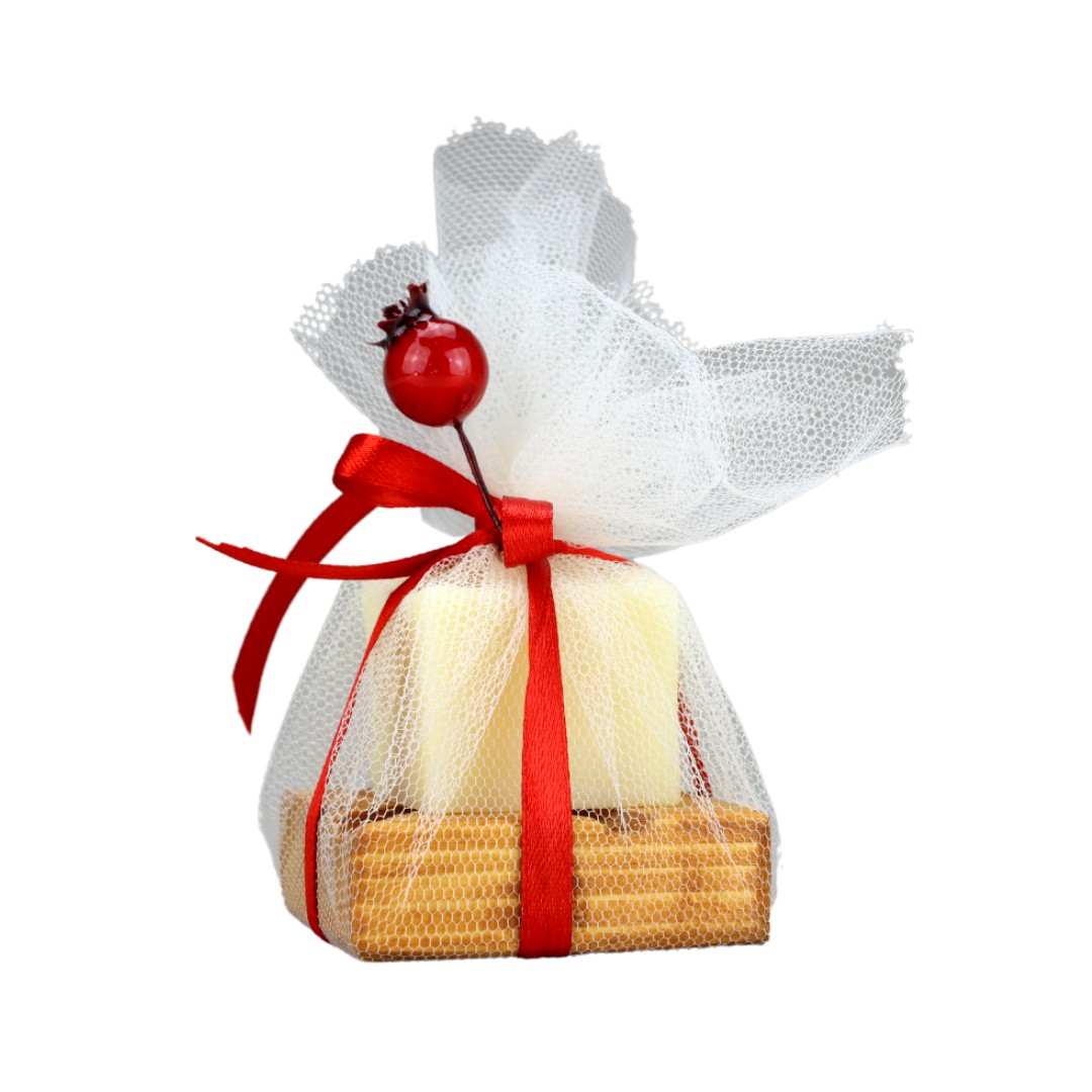 Σετ χριστουγεννιάτικο, ένα σαπούνι περιορισμένης κυκλοφορίας με άρωμα βανίλια σε τούλινο περιτύλιγμα και πάνω σε μικρή τετράγωνη ξύλινη βάση. Ιδανικό για στολισμό του γιορτινού τραπεζιού, θα δώσει μία ξεχωριστή νότα και ένα μεθυστικό άρωμα στο χώρο.